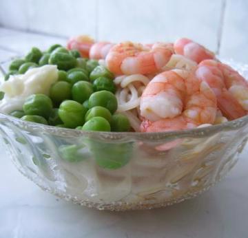 蛋黄面1人份,活虾8只,青豆20克,食盐半茶匙,美极鲜味汁1茶匙,丘比沙拉酱1茶匙