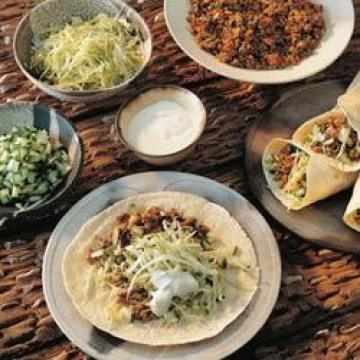松子仁100克,橄榄油1汤匙,大洋葱1颗,瘦牛肉碎或羊肉碎500克,小茴香末1汤匙,多香果末1茶匙,罐装番茄块200克,香菜(芫荽)1束,胡瓜(黄瓜)1根,鲜嫩莴苣(生菜)1/2棵,配菜:,酸奶油200毫升,墨西哥玉米薄饼或皮塔面包8片