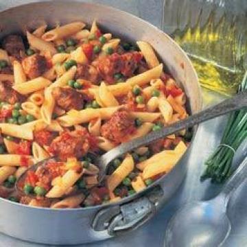 中等大小洋葱1颗,大蒜1瓣,橄榄油1汤匙,传统瘦肉香肠500克,白兰地、白葡萄酒或清鸡汤3汤匙,罐装番茄块400克,盐、黑胡椒适量,新鲜斜切通心粉500克或,干斜切通心粉350克,冷冻豌豆150克,点缀:,细香葱1小束,配菜:,巴马乳酪