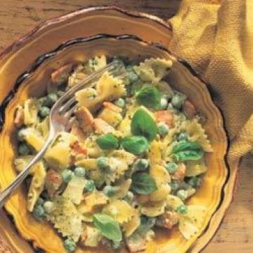 水煮马铃薯500克,加拿大腌熏猪肉(培根)300克,中等大小洋葱1颗,干蝶形面或其他形状意大利面225克,盐、黑胡椒适量,冷冻豌豆175克,橄榄油11/2汤匙,香蒜酱85克,酸奶油300毫升或原味希腊酸乳酪300克,点缀:,新鲜罗勒叶,配菜:,巴马乳酪40克