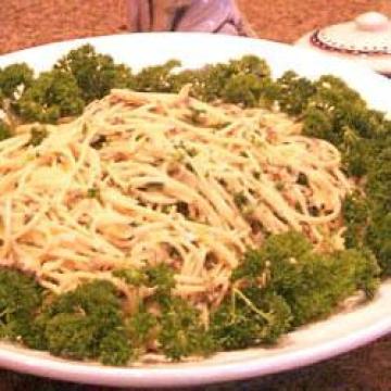 3.用一个大碗,将意大利面和蛤肉搅拌在一起,再用些欧芹和干酪点缀即可。