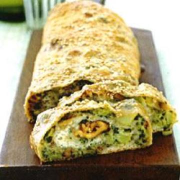 青花菜(西兰花)225克,煮熟,切粗丁(约11/2杯),半脱脂莫扎瑞拉(mozzarella)奶酪碎115克,波罗伏(provolone)奶酪碎60克,核桃150克,切粗粒,大蒜2瓣,切末,干罗勒1/2茶匙,揉碎,冷冻比萨面团1条(约280克),大鸡蛋1个,放入1汤匙牛奶打散(作淋面料),白芝麻2茶匙