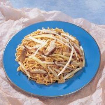 干伊面80克,豆芽160克,晒干香菇丝40克,鲜香菇丝40克,韭黄40克,花生油2汤匙,绍酒1茶匙,高汤120毫升,酱油1汤匙,蚝油1汤匙,麻油少许