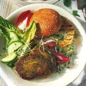 4人份,胡萝卜350克,大蒜1瓣,新鲜香菜(芫荽)1大束,罐装鹰嘴豆400克,小茴香末11/2茶匙,香菜末11/2茶匙,大鸡蛋1个,面粉2汤匙,食油(煎炸用)适量,配菜:,汉堡牛排面包或小圆面包、沙拉。