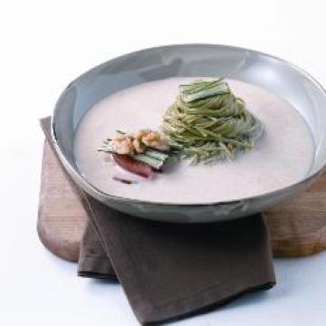 生豆浆,300毫升,水,200毫升,烤过的加州核桃,30克,芝麻,1大匙,西红柿,1/8个,黄瓜,1/2个,盐,少许,冰块,6个,装饰用的整颗加州核桃,1-2个,绿茶面,100克