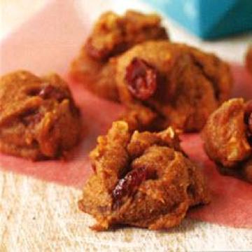 中筋面粉60克,全麦面粉60克,肉桂粉1/2茶匙,盐1/4茶匙,小苏打粉(bakingsoda)1/4茶匙,众香籽粉(groundallspice)1/4茶匙,黄砂糖50克,压紧,蜂蜜3汤匙,蔬菜油60毫升,大鸡蛋白1个,罐装南瓜泥450克,压紧,加糖的干蔓越橘或无籽黑葡萄干70克,核桃150克,剁碎(可选)