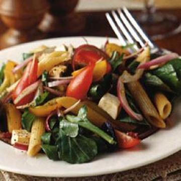 翎(斜)管面(penne)或车轮面(rotelle)225克,樱桃小西红柿或圣女小西红柿340克,对半切开,小红洋葱1/2个,切片,芥子菜(芝麻菜,arugula)115克,切碎,烟熏莫扎瑞拉(mozzarella)奶酪85克,切丁(1.5厘米见方),西红柿干2汤匙,切碎后放入沸水泡10分钟,去核黑橄榄2汤匙,切碎,橄榄油1汤匙,意大利陈年果醋(balsamicvinegar)1汤匙,盐1/2茶匙,黑胡椒粉1/4茶匙