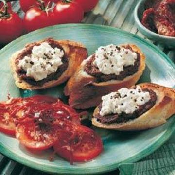 小番茄6—8个,油浸晒干番茄12个,特纯橄榄油3汤匙,香脂醋1汤匙,盐、黑胡椒少许,法式面包1条,红香蒜酱4—5汤匙,或全粒芥酱2汤匙,新鲜软山羊乳酪175克
