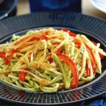 1.青木瓜去皮切丝,以1茶匙盐腌渍半小时,取出挤干水分。