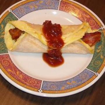 2.将玉米饼摊在整个蛋上,当蛋变硬并与玉米饼沾在一起后,翻一面让培根在上面。在培根上倒上辣酱然后卷起来。起锅切成小块,趁热吃即可。