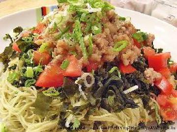 材料:绿茶面线2把,猪绞肉300克,葱1根,蕃茄2颗,干燥海带芽5克