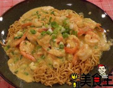 第二种:面食菜谱材料:,鸡蛋意面4把,奶水半杯,大白虾15只,葱花2大匙,蒜末1大匙,起士片2片,奶油1大匙,蛋黄粉2大匙做法