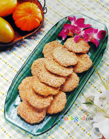 4、净锅滑好,下入调好的虾蓉,按成圆饼,拍上芝麻,慢火煎熟,装盘即可。