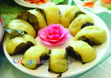 3、用面剂按压成中间厚、四周薄的大片,包上肉馅,制成椭圆形生坯,外包橙树叶,上笼大火蒸10分钟,出锅装盘即成。