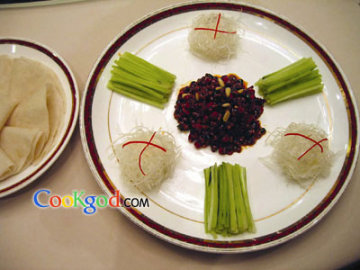 3、黄瓜洗净,去皮后切成长5厘米、宽0.2厘米的细丝;葱洗净,切成长5厘米的细丝,放入清水中浸泡10分钟,取出控水;红椒洗净,切细丝;然后将黄瓜丝、葱丝摆入盘子的四周,葱丝上面点缀红椒丝;摆在盘子周围待用。