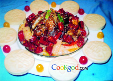 3、另起锅放底油烧至五成热,放入花椒、灯笼椒大火煸香,加入2中的卤汤、海参段、鱿鱼卷、蹄筋,勾芡、淋明油浇到肘子上面,四周摆上蒸好的喜饼即成。