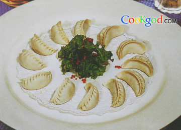 2.和面,擀成圆形皮子,包成月牙蒸饺,上笼蒸熟即可。