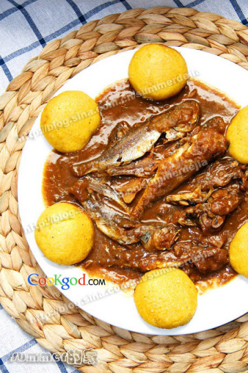 2、勺留底油,用葱、姜、大料炝锅,放入炸好的小黄鱼,烹料酒、米醋,加适量的汤,调味,炖熟盛入铁锅内,放香葱段,玉米面饼子围在铁锅内的四周即可。