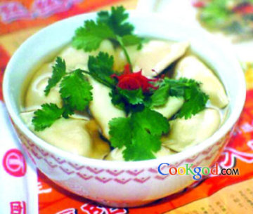3、面粉加水揉成面团,下剂后用擀面杖擀成中间稍厚的圆皮,包入制好的馅心,下入开水锅煮两分钟即成。