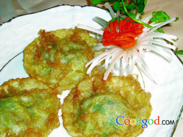 主料:革命菜500克,美玫粉(美玫粉是一种低筋面粉,也可以用其他面粉代替)500克,河虾仁250克。调料:姜汁酒10克,白胡椒粉2克,盐3克,鸡精7克,香油10克,色拉油750克,鸡蛋液4只。