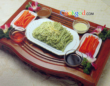 3、鸡蓉铺生粉,擀制成片,切成面条状,煮熟,捞出沥水,装盘,跟四味碟上桌即成。