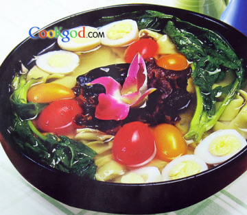 5、锅上火加入高汤,烧沸后加入精盐、味精、胡椒粉、木耳,略煮后倒入放面条的碗中,再在放面的碗上摆入熟菠菜、鹌鹑蛋、红黄圣女果即成。