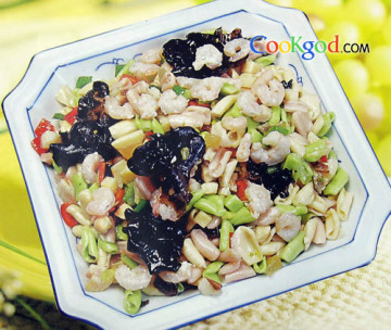 3、将炒锅上火,烧热后加少许葱椒油,待油五成热时,再下入葱花、姜末煸炒一下,后下入划好油的虾仁丁、草鱼丁、鸡丁、辽参丁、红椒丁、香菇丁、木耳丁、鲜笋丁、绿椒丁翻炒匀后,加精盐、生抽、料酒、胡椒粉、味精、高汤翻炒入味,再下入煮好的三色猫耳朵翻炒一下,装盘即可上桌。
