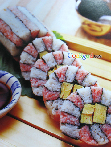 1、将厚蛋烧切成1厘米宽的条,用紫苏叶卷起,将一半量的寿司饭与鱼松粉混合成粉红色,另一半寿司饭备用。