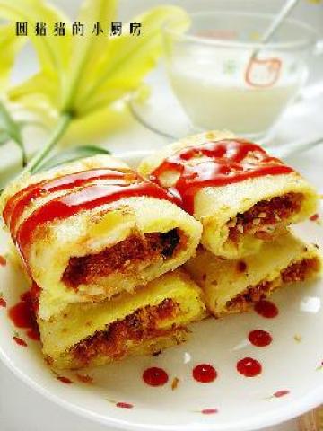 4,将煎好的蛋饼皮放在盘上,鸡蛋面朝上,铺上素肉松,挤上甜辣酱,再将整张饼卷起即可