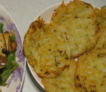 4、平底煎锅烧热,加少许油,把土豆丝面糊煎成两面金黄的小饼饼;