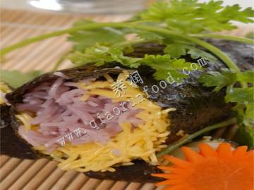 3.取一片海苔片,铺上适量做好的荞润面、蟹肉条后卷起,再依次沾上低筋面粉、蛋液、面包粉备用;