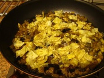出。再放少许油炒香葱姜放入肉末,加料酒生抽炒熟,变色即可,再放进茄子丁,鸡蛋片,加鸡精和水开锅即可。