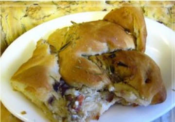 面皮上先抹上轻奶酪,撒椒盐、碎香肠、碎洋葱,卷好,剪成花环 (具体操作请参看花环面包系列)。