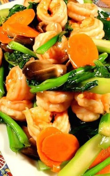 虾,芥蘭,草菇,罗卜,姜三片,酒,盐,蚝油,糖,味精,芡汁.
