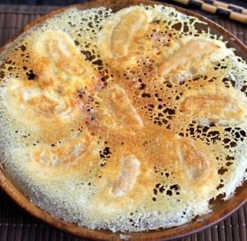 等听到锅里有声响了,表明水分快要烤干了。看到面粉水变金黄色,锅边的皮已经能脱离锅边了就差不多了。用一个盘子盖住平底锅,倒扣过来,饺子自己就落到盘子里了,如果掉不下来,就是烤得还不够,继续加热一会儿。