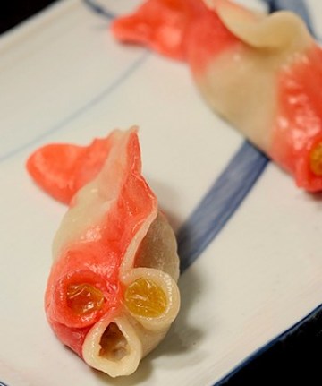 金鱼饺:分别将原色和红色面团分成2份,各取一分揉捏成1.5厘米直径的条,再各分成两份,四条颜色错开并列一起。然后再揉成1.5厘米直径的条,再切成16份。取一分压扁擀成直径10厘米的皮,放上1大匙馅料,对折捏起3/4段留一角开口,然后捏出有三孔的形状,用筷子打开三个口,上面两个口各放一粒葡萄干,将背部尾部面捏薄成金鱼状个。做好的金鱼饺放入铺了烤盘纸的蒸笼里,大火蒸10分钟即可。