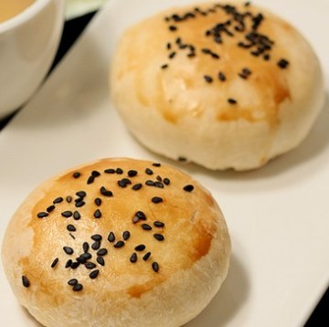 6、表面刷上蛋液,撒上芝麻,放入预热好的烤箱中层200°c 25分钟烘烤,烘烤10分钟后阵阵香味飘出,口水啊,时间到即可出炉,趁热吃太棒了!这里是两种口味的,有鲜肉馅和豆沙馅的。