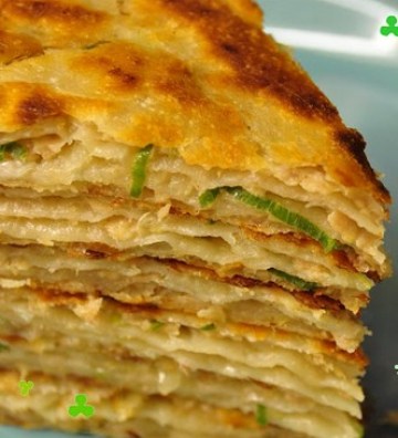 剩余三分之二面团揉成长条,切20份。取2份,每份擀成11厘米直径的薄饼,放上1.5大匙大匙馅料摊匀,放上一片之前煎熟的薄饼,再放上1.5大匙馅料抹匀后盖上另外一片擀好的薄冰皮。周边捏紧封口。如上做好剩余的饼。然后分批放入有1大匙油的不粘锅里,中火两面煎黄即可。