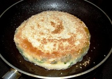 平底锅内放2匙植物油,放入芝麻大饼,先将一面煎至“吱吱”有声,将面饼翻一面,稍煎片刻,再倒入半饭碗凉水,中火焖至水干,开盖,改大火煎至两面金黄,就可以出锅了。