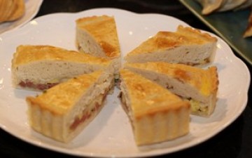 2,把发面团切成两半,先把一半擀成很大的厚薄适中的圆片,铺在塔模上,就像塔皮一样,放入馅料,再把另一半面团擀成圆片盖在馅料上,在表面上用叉子戳上一些小洞,刷上蛋液,放入烤箱中烤25到30分钟,面上金黄即可。烤箱温度设定在350华氏度。