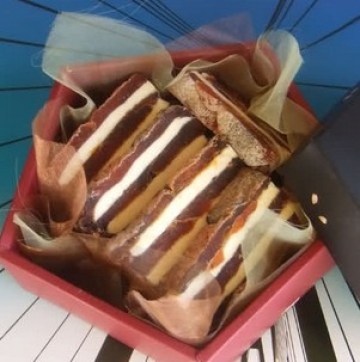 首先将 wrap 撑满整个儿盒子里侧,将柿饼并排铺5块,注意带有白糖粉晶的面朝下,然后并排放牛油6块,依次撒上rum extract ,vanilla extract 和柠檬汁。再重复一遍。总共是3层柿饼,2层牛油。记得最上层的柿饼,白糖粉晶的面朝上。把 wrap 折合起来。用拳头使劲,反复往下挤压几分钟。一定要压结实哦!!!最后,再在上面压一个有点儿分量的东西。放置于冰箱2,3天。
