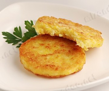 3) 玉米渣拌入面粉和苏打粉,调成厚面糊。舀2大匙面糊入锅,借助模子,压成圆饼。入油锅用小火两面各煎5-6分钟,成金黄色即可。