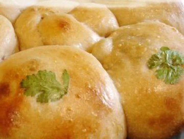 把其中的四个搓成长条然后打结,尾端按到面团后面压紧。另外三个用做包子的方式包了早上给老公做早饭的香辣花菜和土豆馅儿,表面贴上一小片芫荽做装饰。摆到刷上薄薄的butter的烤盘上。