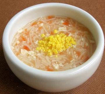 2、撒上碾碎的蛋黄,也可以像蛋黄豆腐羹那样倒入蛋黄液做成蛋花煮熟即可。