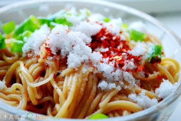 2、调面的过程:抓一把面条,放点干辣椒面、白糖、盐、醋、葱花,就一点冰好的凉白开,拌好就吃吧。