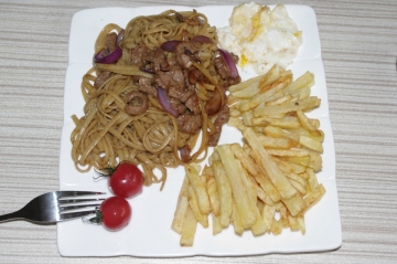 2、小煎锅放油,六七成热放切成条的牛肉,翻炒几下后放洋葱翻炒,牛肉变色后放耗油翻炒几下关火。