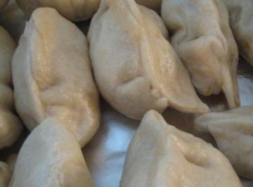 3.发好后面切成小块,擀成面皮,包成包子(因为个人习惯我包成了饺子型),蒸15分钟左右便可以起锅了。