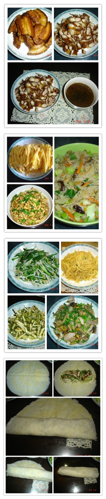 2.水发香菇10只,水泡黄花菜25克,青菜100克,香肠50克,红萝卜50克,洋葱50克全部切丝备用。.