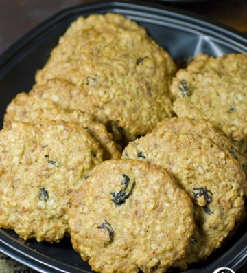 自发粉100克,燕麦粉50克,鲜奶30毫升,牛油10克,蜂蜜2大匙,葡萄干2大匙,鸡蛋2个