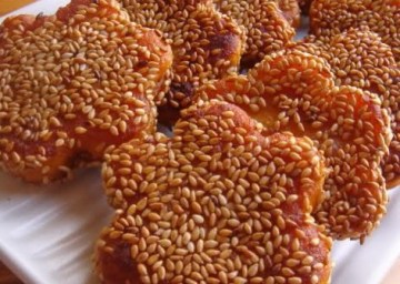 * 取约30克的一小团,搓圆,在铺了芝麻的盘子里滚一下,按扁,小火煎成两面金黄即可。